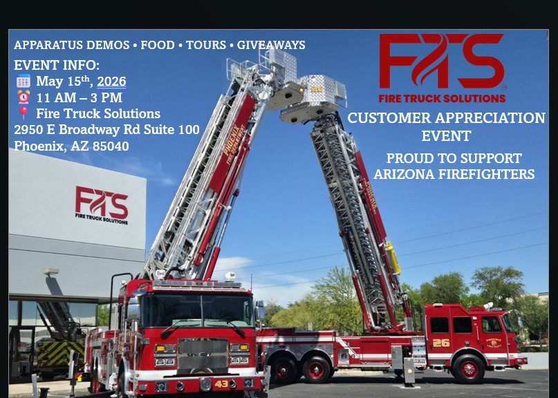 News & Deliveries FDIC is just around the corner. Please be sure to join us for the FTS After Party! April 14, 2026 Please join us for our Customer Appreciation Event on Friday, May 15th, 2026! March 29, 2026 ITURRI Wildland Demo Unit Now Available! March 29, 2026 Fire Truck Solutions and Performance Truck Repair Join Forces in SoCal! October 30, 2025 FTS Named Official Darley Tactical Dealer for AZ, CO, UT, and NV! October 16, 2025 FTS is Now Fouts Fire Dealer for Arizona! October 16, 2025 FTS Techs Jeremy Bushman and By Nguyen Attend 2025 Fire Truck Training Conference October 13, 2025 Fire Truck Solutions is Expanding in Colorado! October 3, 2025 Final Inspection of Five Cyclone Pumpers for Salt River Pima-Maricopa Indian Community! August 7, 2025 Push-in Ceremony for Mormon Lake’s New Iturri Wildland Type 3! July 30, 2025 Check Out These Highlights From Our Open House Event! June 30, 2025 Mark Julien Named #1 Salesperson for E-ONE for 2024! June 3, 2025 FTS is Now a Full-Line Task Force Tips Distributor for Arizona and Colorado! May 31, 2025 FTS is Proud to be a Corporate Sponsor for The Hall of Flame Museum in Phoenix! May 25, 2025 Mark Julien Shares the History and Vision for FTS April 1, 2025 FTS Parts Manager Josh Julien Races in 2025 Copper Classic! March 8, 2025 FTS Wishes Happy Retirement to Cottonwood Battalion Chief Larry Dawson February 27, 2025 FTS Awarded U.S. Forest Service Contract for Type 6 Refurbs February 18, 2025 Rest in Peace, Phoenix Fire Captain Anthony Mock January 29, 2025 Three new Spartan FC-94 Tankers for the Hualapai Tribe! January 10, 2025 Walk Around of Mesa Fire & Medical Department's E-ONE Custom Pumper December 27, 2024 Polaris Government & Defense Demo Units Have Arrived! December 16, 2024 FTS is Now an Authorized Reseller for Polaris Gov't & Defense Vehicles! November 27, 2024 FTS Delivers New E-ONE Cyclone 100' Platform to Glendale Fire October 25, 2024 Check Out the Best in Class ITURRI Wildland 3! September 22, 2024 Rest in Peace Officer Zane Coolidge, end of watch Sept. 6, 2024 September 19, 2024 FTS Named Official ITURRI Dealer for Arizona, Utah, and Nevada! July 11, 2024 FTS is Now Authorized Dealer/Installer for Cold Cut Cobra! July 11, 2024 Another new E-ONE Engine for our Friends at Mesa Fire June 27, 2024 E-ONE eMAX Pumper Delivered to Blue Ridge Fire June 20, 2024 Two New E-ONE HP 95 Mid-Mount Platforms for City of Phoenix May 8, 2024 FTS Delivers E-ONE Vector to City of Mesa, First All-Electric North American Style Fire Truck May 8, 2024 FTS Delivers E-ONE Typhoon 100' Platform to City of Cottonwood "The Grizz" May 8, 2024 Final Inspection for Blue Ridge E-ONE eMAX Pumper May 8, 2024 eMAX Pumper Ready for Delivery to City of Glendale May 8, 2024 KME Custom Rescue Delivered to Golder Ranch Fire May 8, 2024
